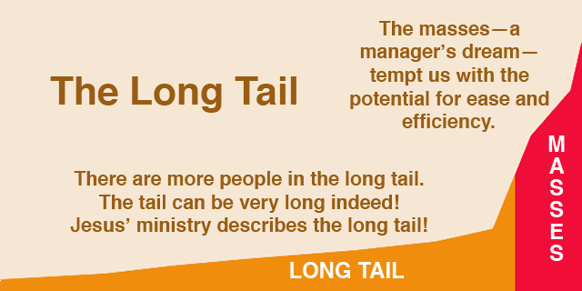 Jesus’ approach to ministry describes the long tail. Seek and serve the marginal members of society—everyone from the rich man and educated Nicodemus—to the dead, infirm, and dying—to the women and children with no status—to the foreigners.